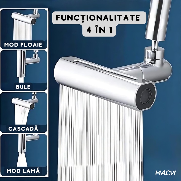 Baterie de bucatarie Macvi® 4 in 1 cu cascada, pivotanta 360°, robinet extensibil multifunctional din otel inoxidabil 304, rezistent la coroziune si uzura