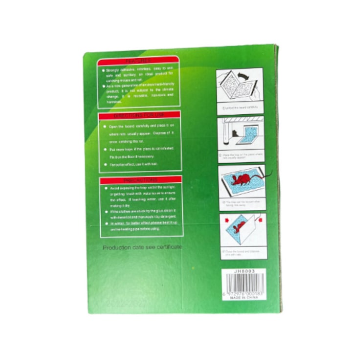 Capcana cu adeziv pentru șoareci și șobolani tip carte este soluția ideală pentru a scăpa de aceste dăunătoare. Cu un adeziv puternic, fără miros și ușor de folosit, această capcană asigură un mod sigur și igienic de a prinde șoarecii. Face parte din noile produse prietenoase cu mediul, fiind reciclabilă și netoxică, astfel contribuind la protejarea mediului inconjurător.